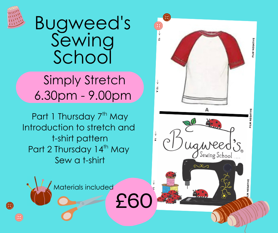 Bugweed's Limited Bugweed's Limited, Unit 3, Marrtree Business Park, Stirling Road, York, North Yorkshire, United KingdomPlease note this is a two part workshop. Part 1 Thursday 7th May 6.30pm - 9.00pm Part 2 Thursday 14th May 6.30pm - 9.00pm One payment covers all sessions and materials and pattern is included. Part 1 Thursday 7th May 6.30pm - 9.00pm The first session of this Simply Stretch sewing course will focus on […]