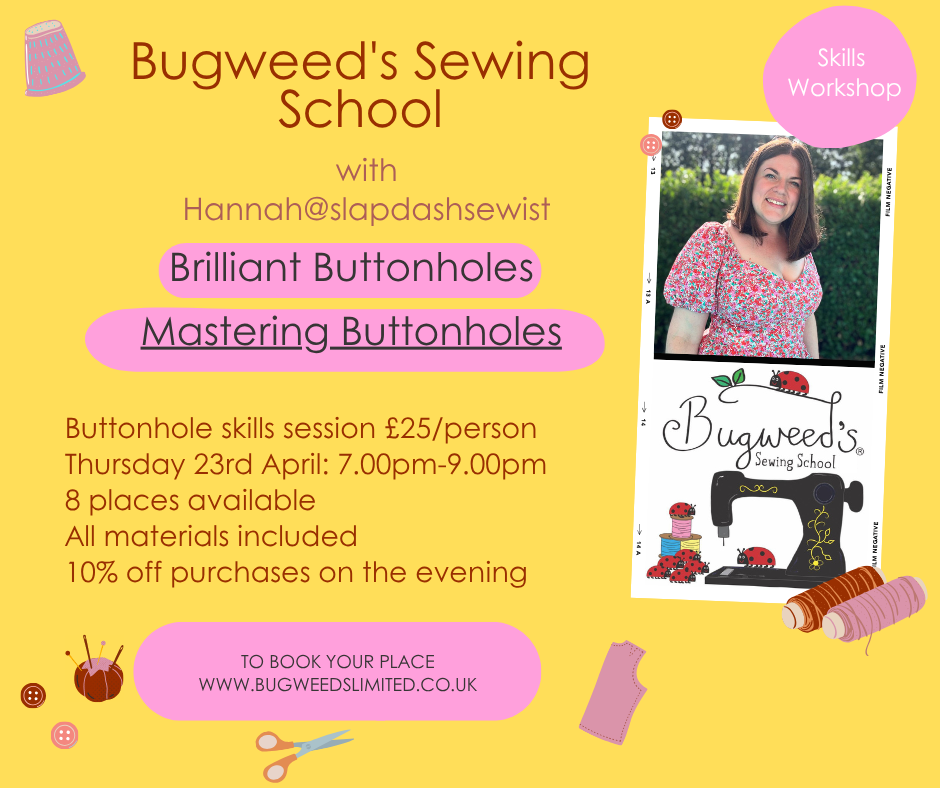 Bugweed's Limited Bugweed's Limited, Unit 3, Marrtree Business Park, Stirling Road, York, North Yorkshire, United KingdomWelcome to the Skills Sessions of Bugweed's Sewing School with Hannah. In this session you will work on becoming a master of buttonholes! Many a sewist dreads the buttonhole feature on their garments and so now is your chance to conquer that fear and become confident in sewing a buttonhole. Hannah will be working through […]