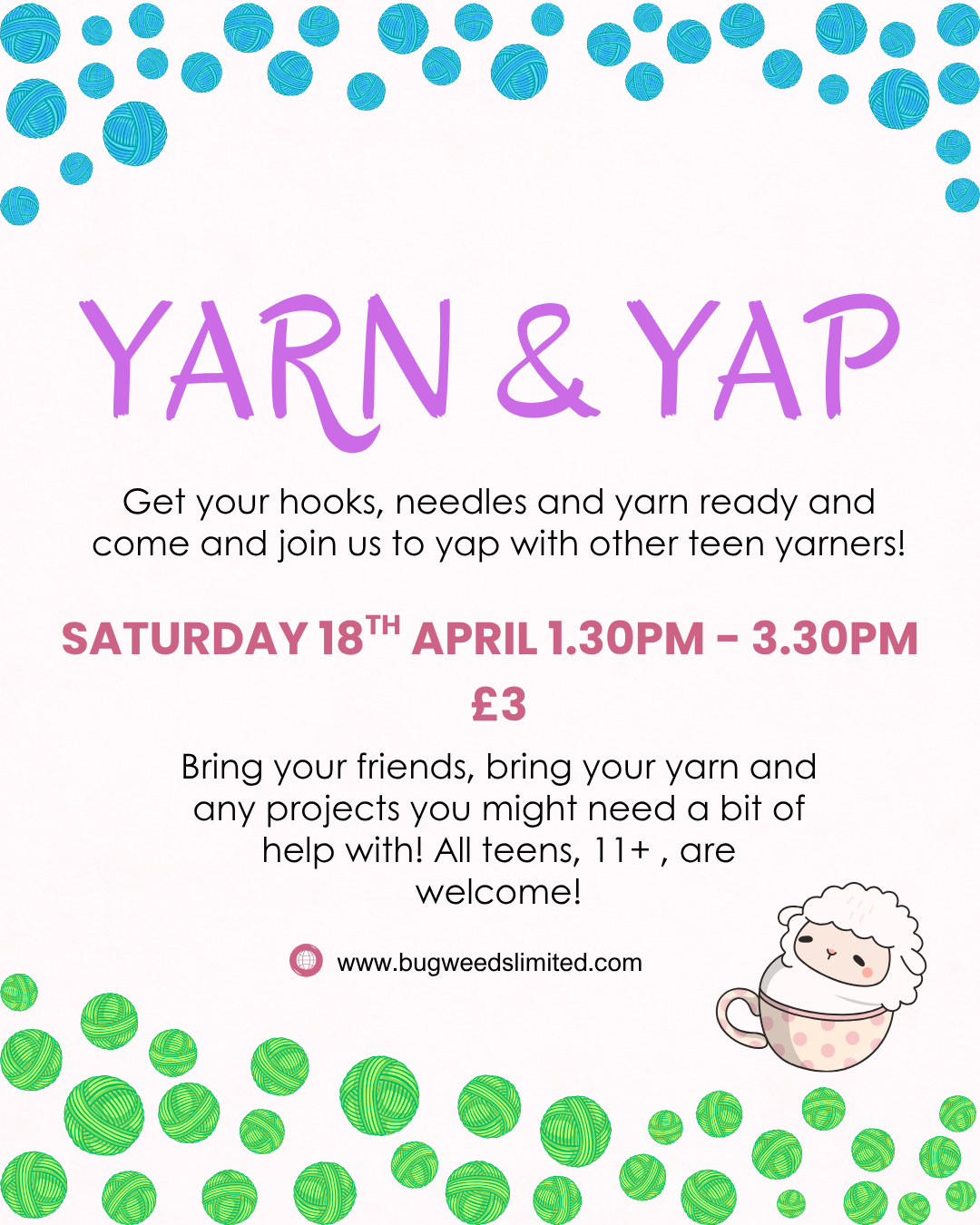 Bugweed's Limited Bugweed's Limited, Unit 3, Marrtree Business Park, Stirling Road, York, North Yorkshire, United KingdomWelcome to a brand new social for Bugweed's! This is exclusively for all those teens out there that knit and crochet and want to meet up with like minded yarners. Ellie and Lydia, our fabulous Saturday teen staff, have organised the perfect social for all teens keen to chat with others about all things yarn. […]